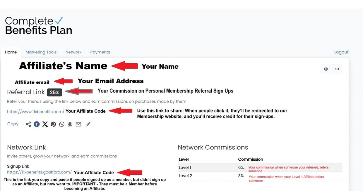 The Network page provides information on your Network, including your Affiliates who signed up.
